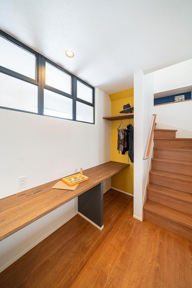 洗⾯室は室内⼲しもできる広さ。取り込んだ洗濯物を畳んだり、アイロンがけのできるカウンターも設置