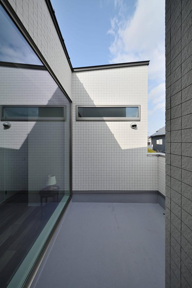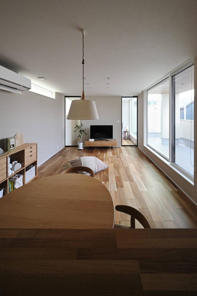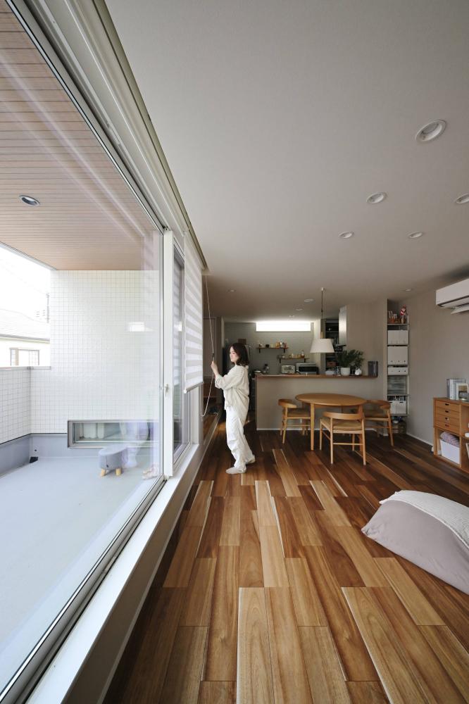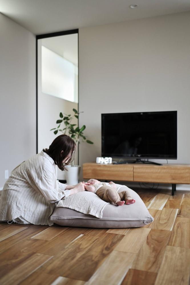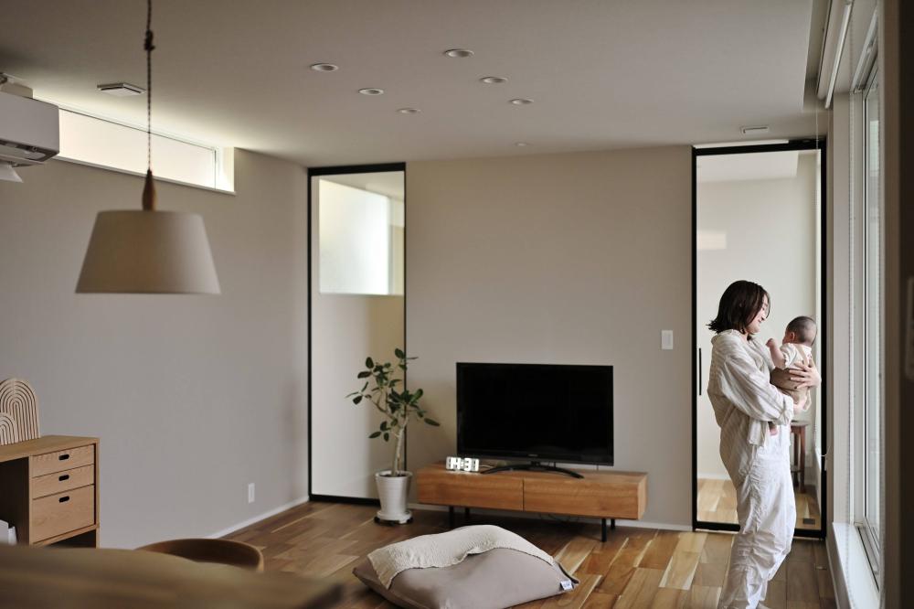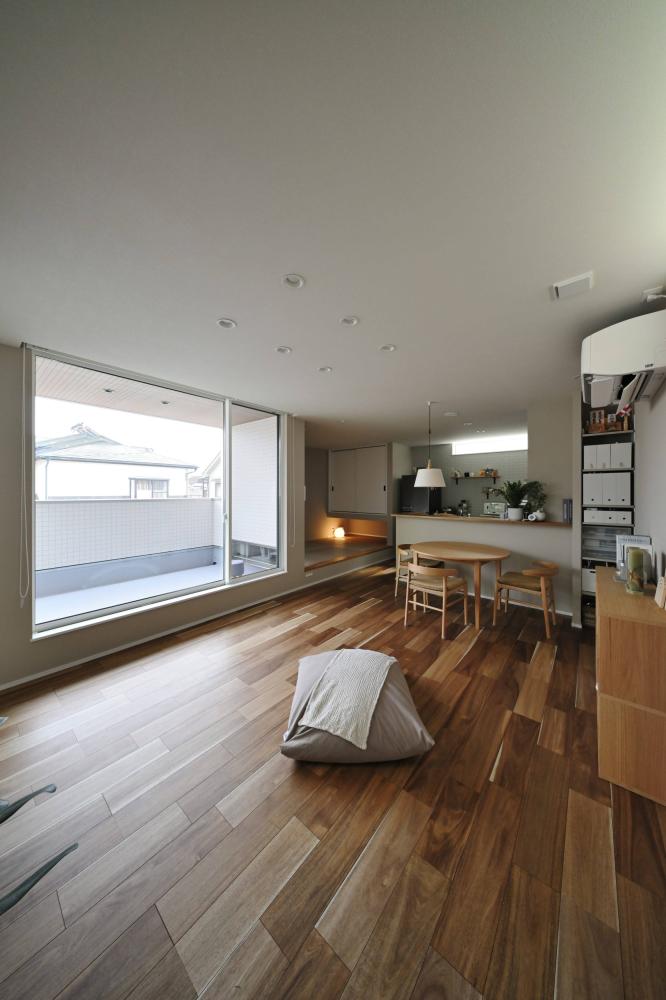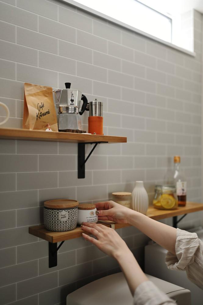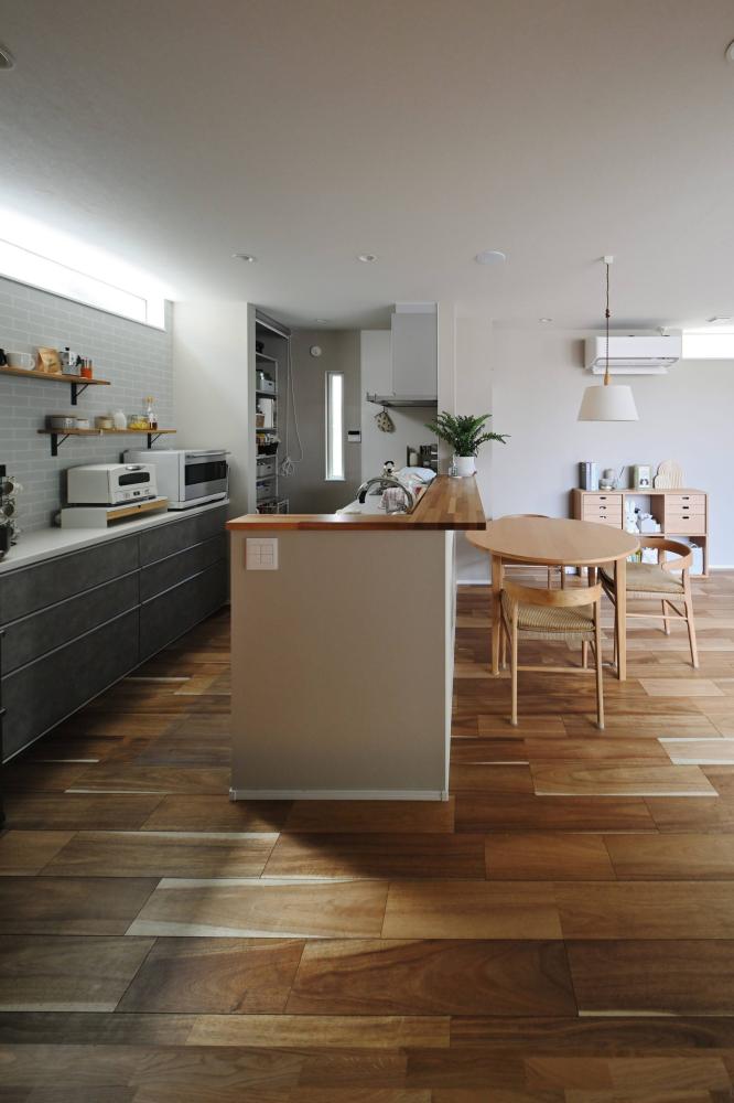 木の温もりに包まれる、家族のプライベート空間 クールな外観から一歩中に入ると、広がるのは無垢材の床が心地よい、開放的なLDK。大きな窓から注ぐ自然光が、家族の団らんを明るく照らします。 内装は、グレーのサブウェイタイルをアクセントにしたカフェライクなキッチンや、木の質感を活かした造作棚など、シンプルながらも細部にこだわりを散りばめました。