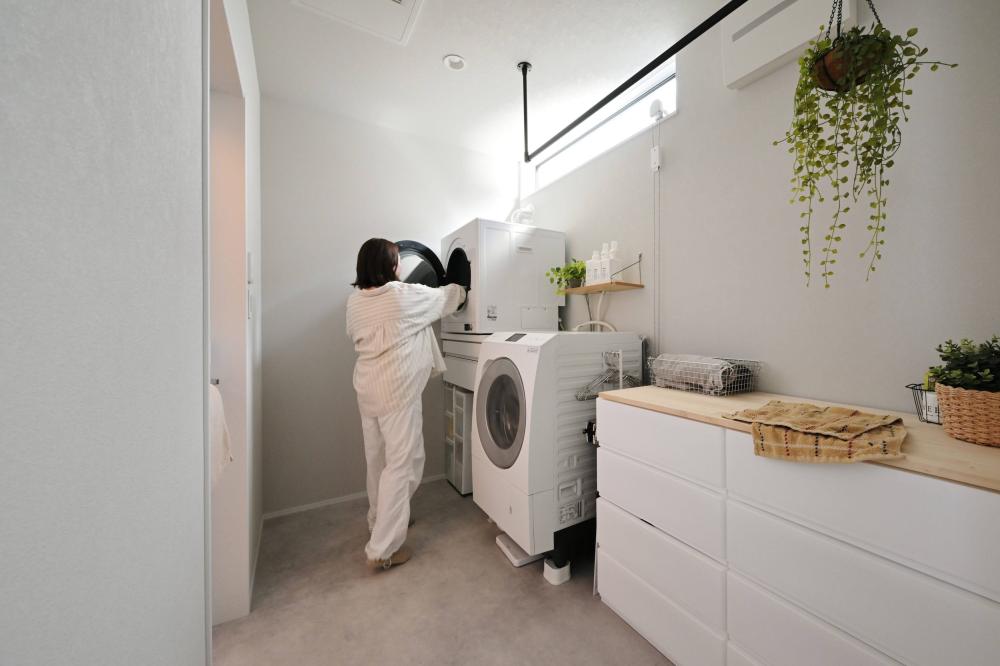 高窓から柔らかな光が降り注ぐ、清潔感あふれるランドリールーム。 ここなら、毎日の洗濯も「作業」ではなく、気持ちを整える「リフレッシュの時間」に変わりそうです。