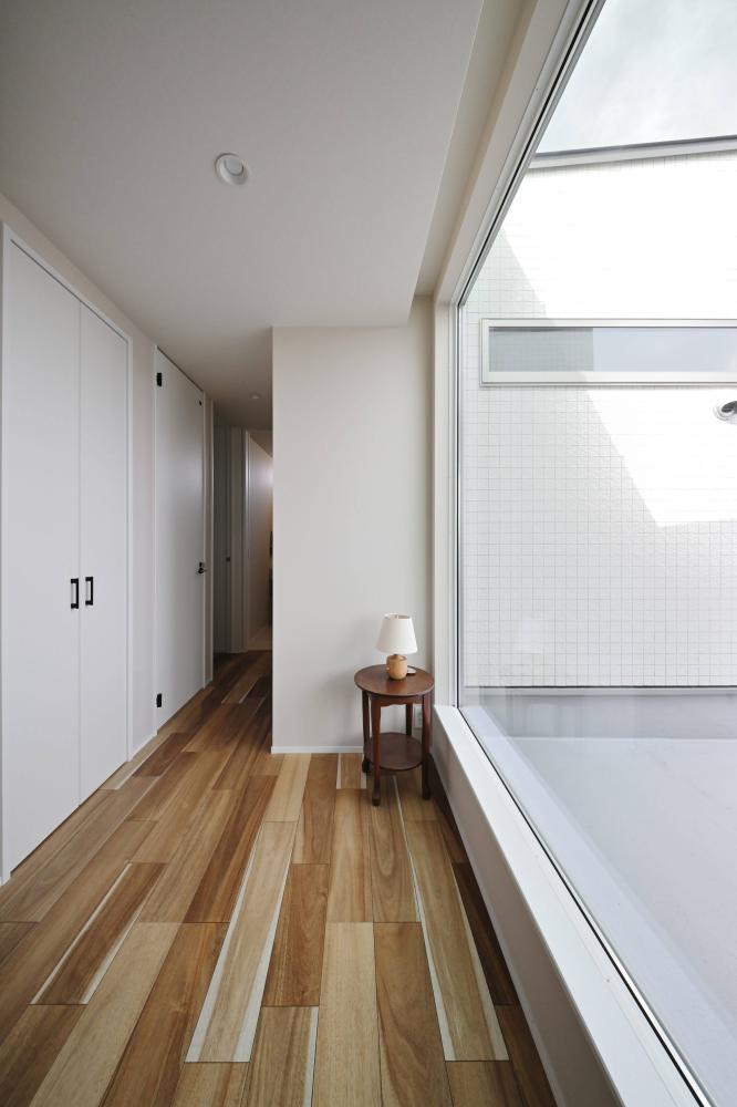壁一面の木の質感と、 足元から優しく光を取り込む地窓(じまど)。