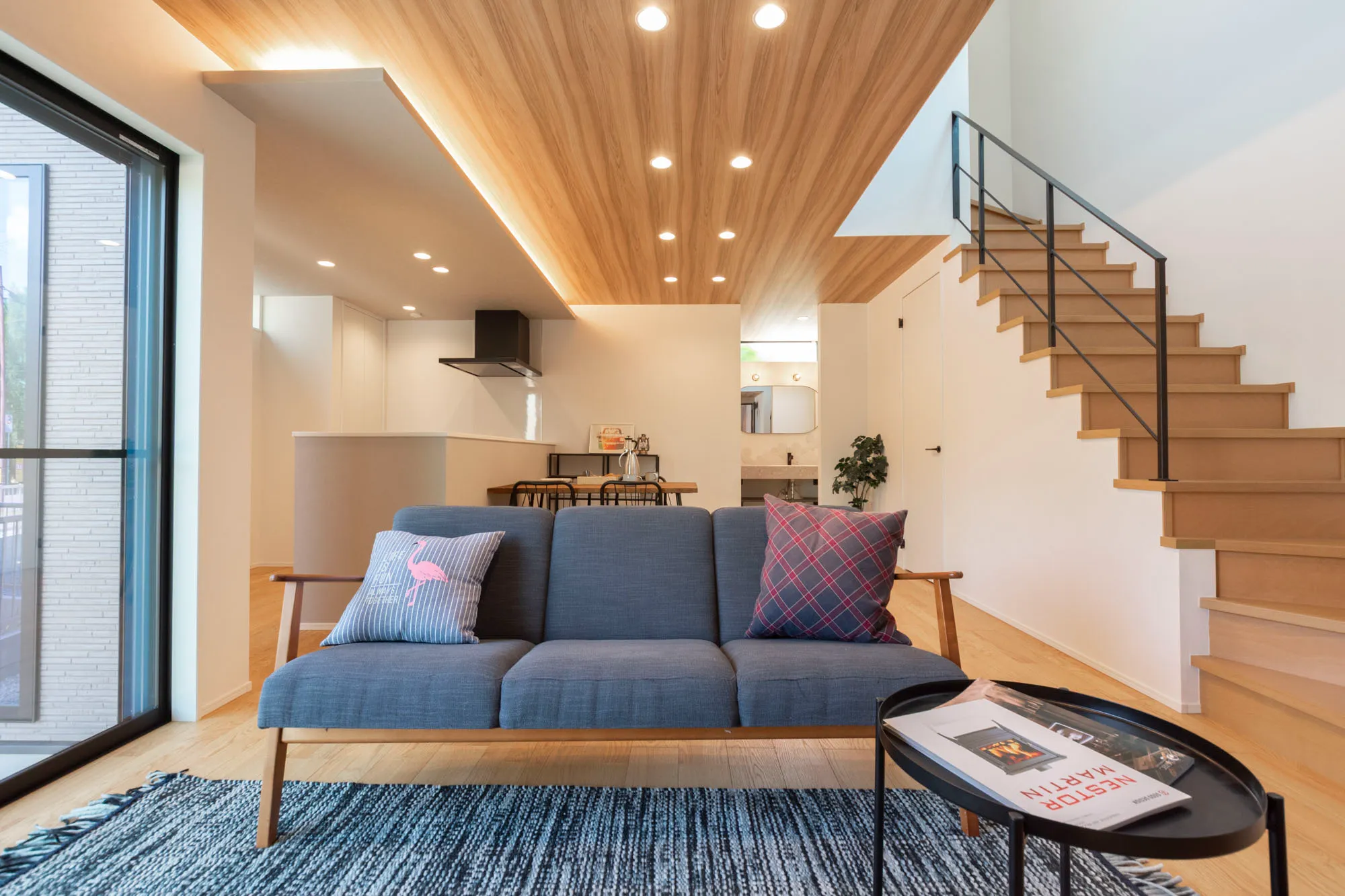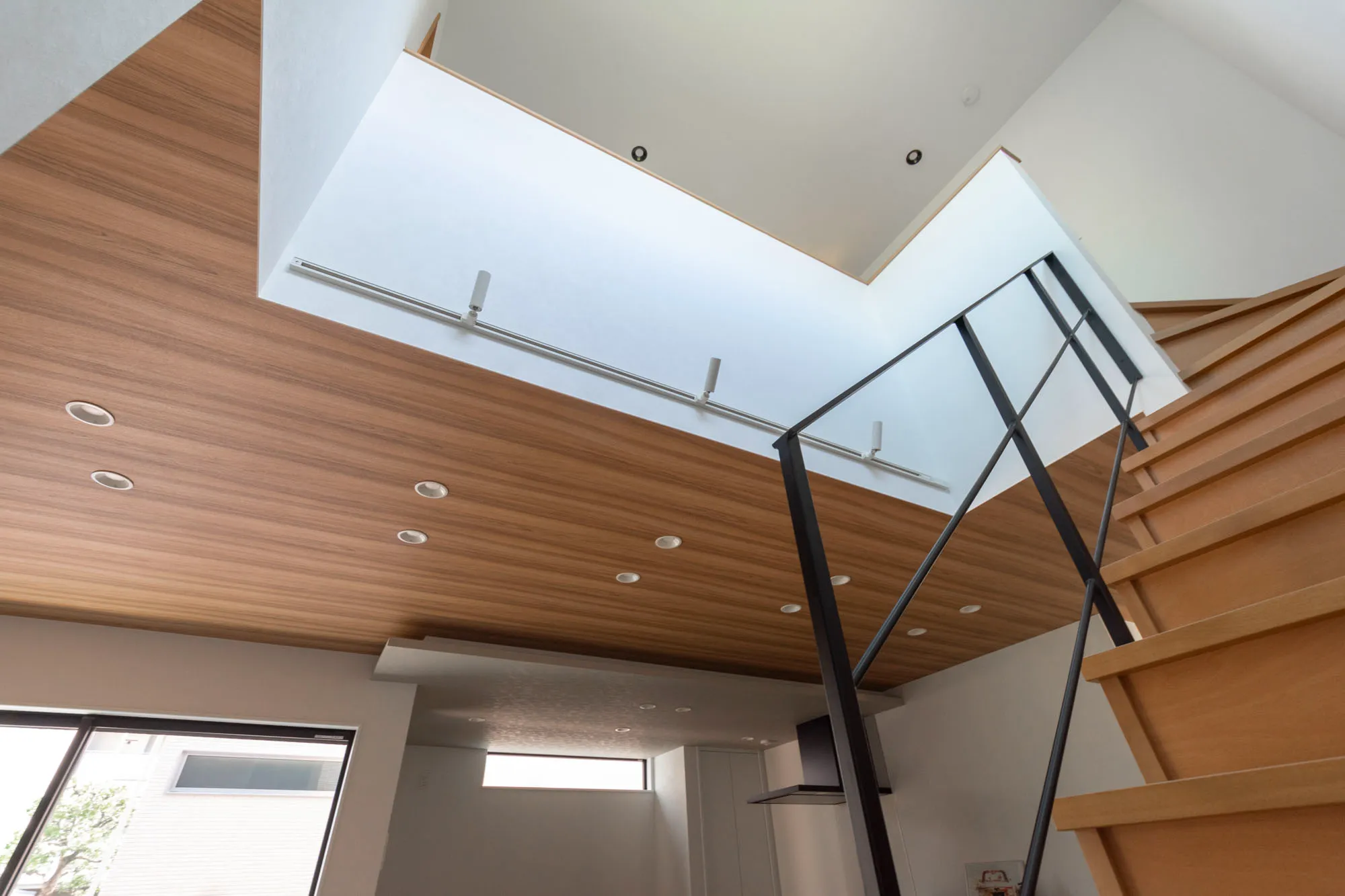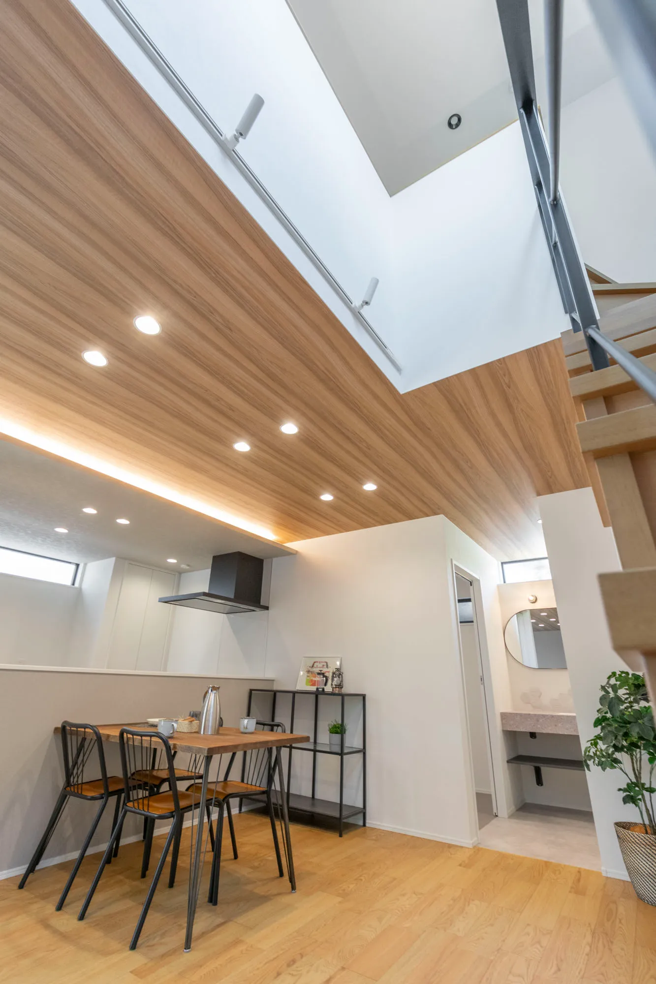 視界を広げてくれるLDK天井も木目クロスと階段の吹き抜けは圧巻です。