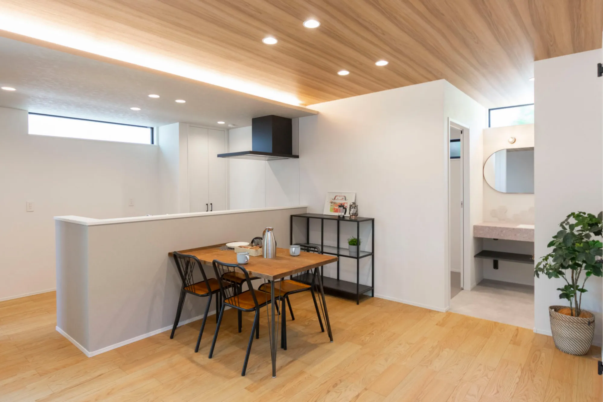 空間をゆるやかに仕切ってくれる下げ天井は隣のリビングを引き立たせてもくれるので開放感もアップ。下げ天井と腰壁のクロスをグレーで統一させすっきりまとめました