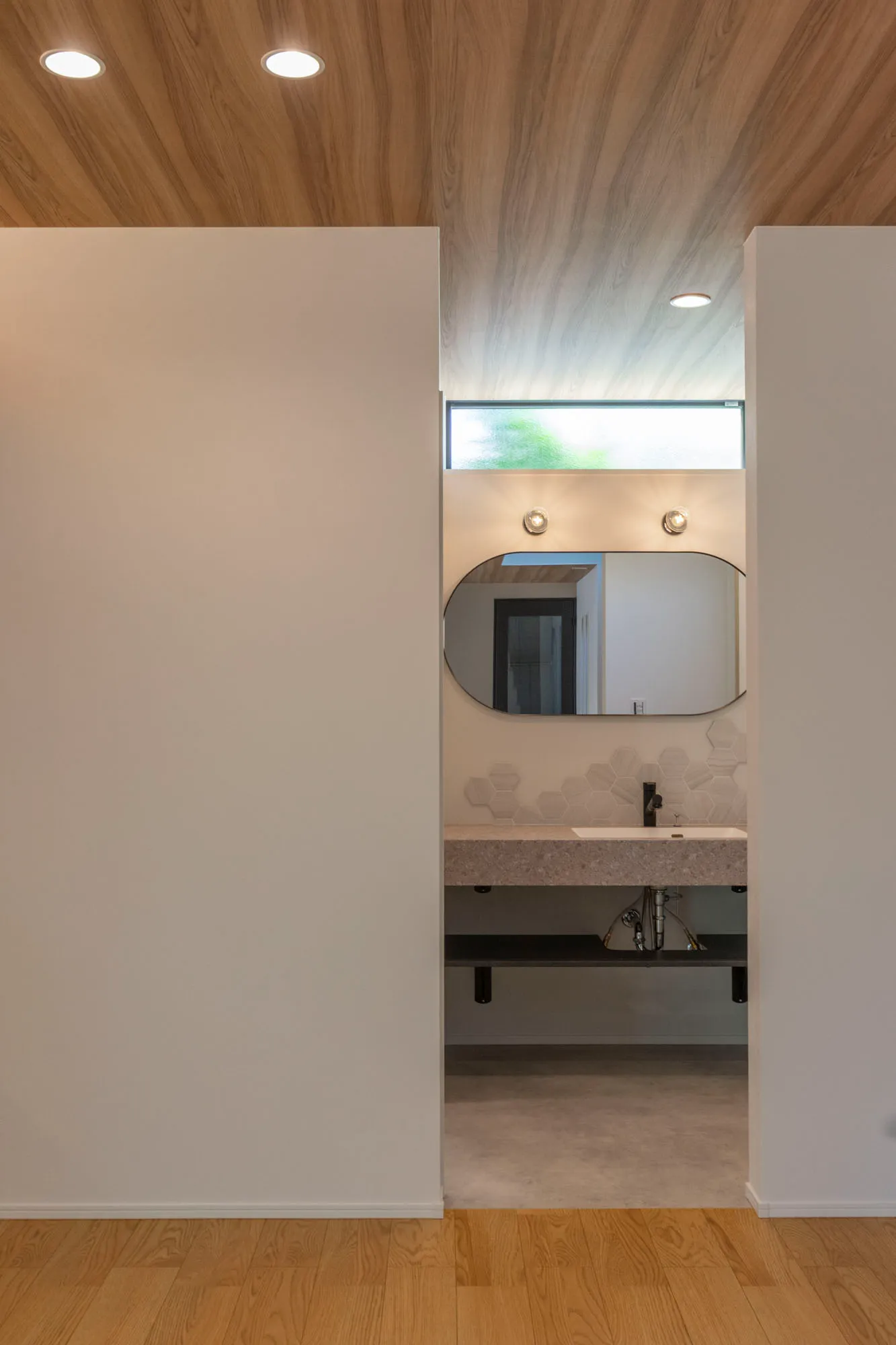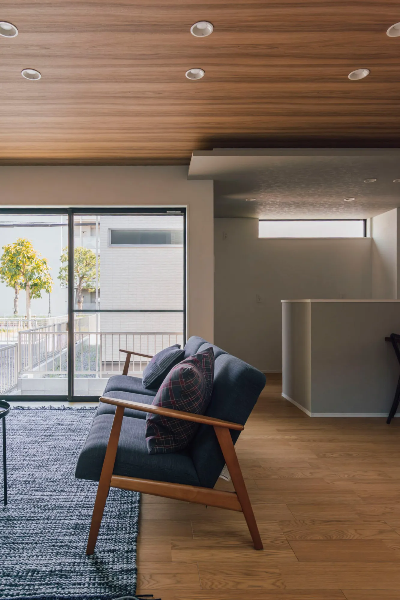 自然と視界が広がるLDK。リビング入り口から洗面所まで木目のクロスをはりました。自然と目線がのびて空間を広々感じます。