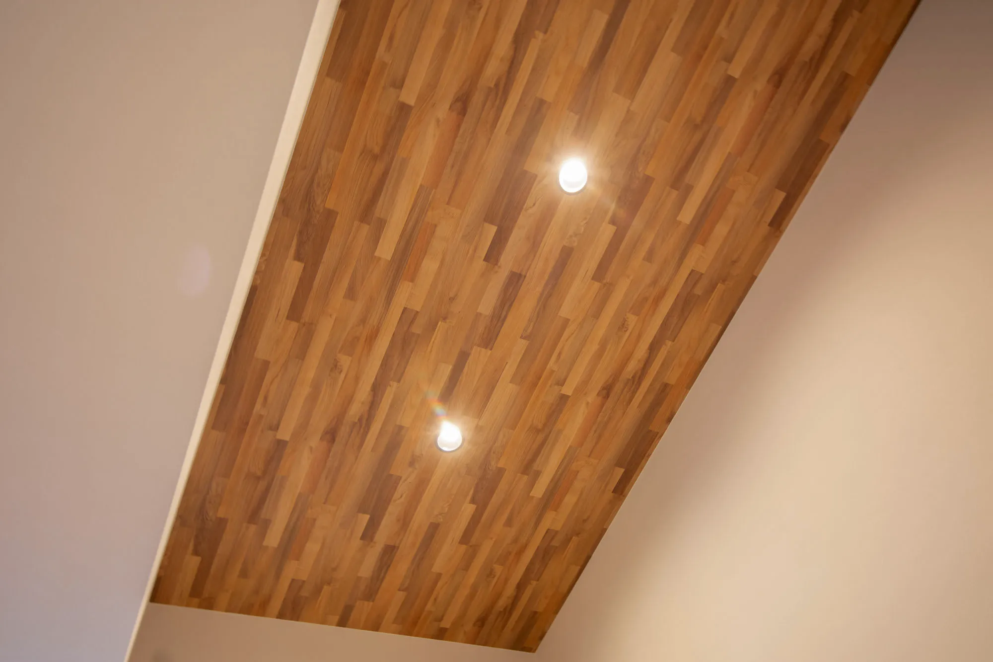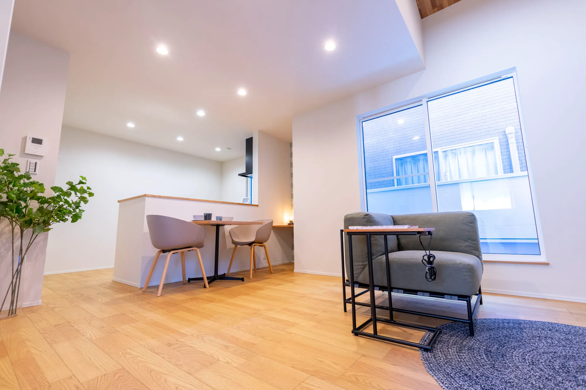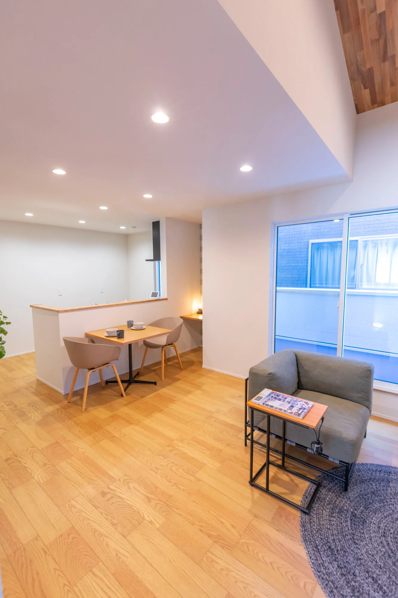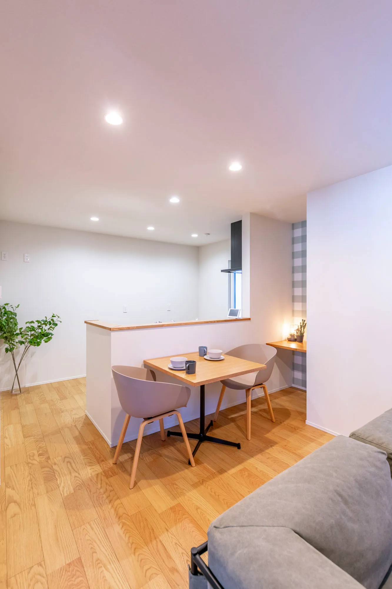 リビングは2階にございますので狭小地でも十分な最高を確保。リビング側の天井は勾配天井になっており空間を広く見せるだけでなく木目クロスでおしゃれに魅せます。ギンガムチェックのクロスがかわいいスタディカウンターも一押しポイント