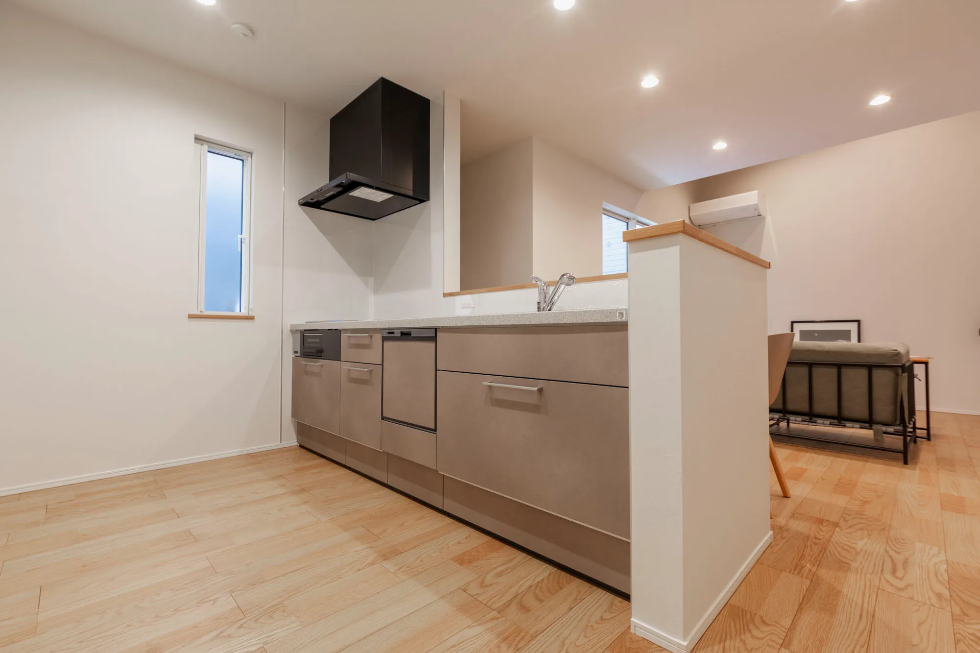 対面式のシステムキッチン。食洗器があるだけでQOLが上がる!汚れが目立ちにくいデザインを採用しました