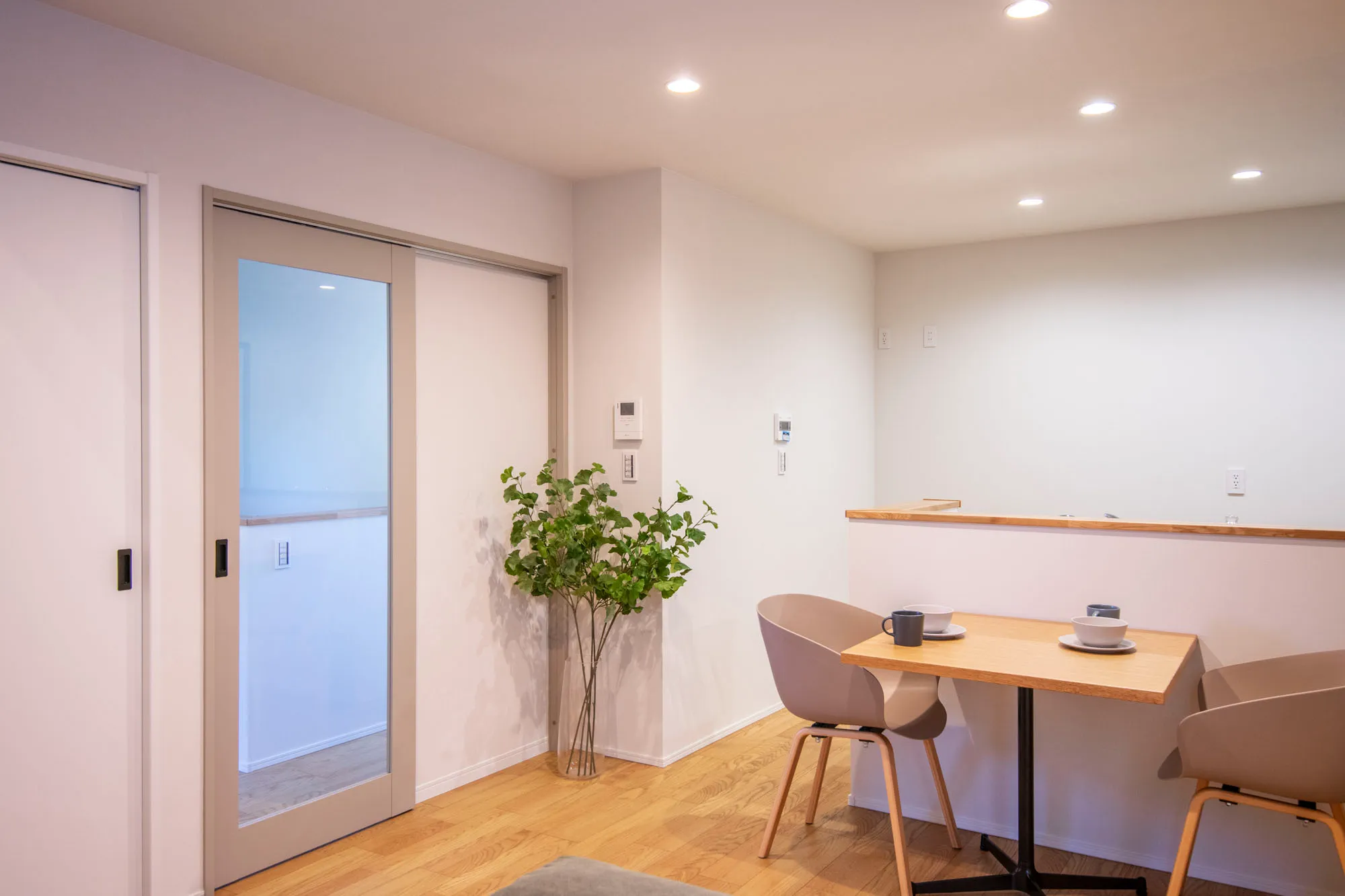 開放感のあるガラスのスライドドアで狭小地を感じさせない
